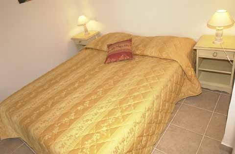 double bed 160x200 except for 1 studio (140x200), 2 lits « gigognes » 90x200, 1 coffee table, 1 table + 4 chairs