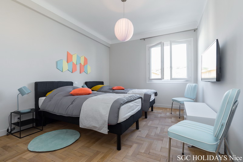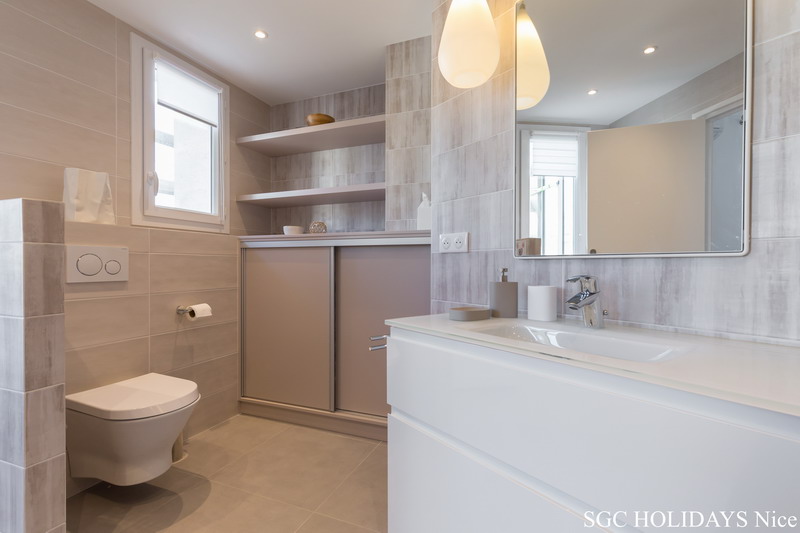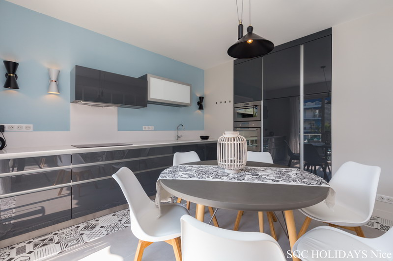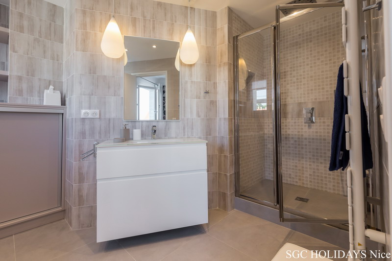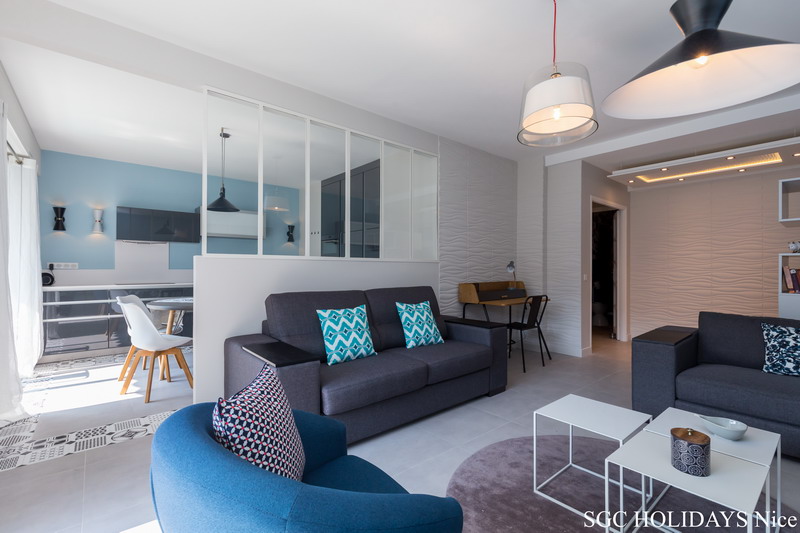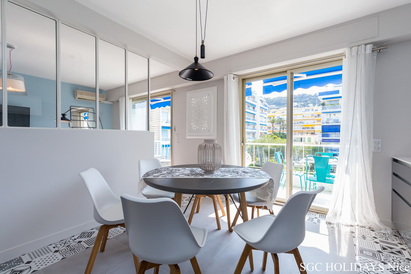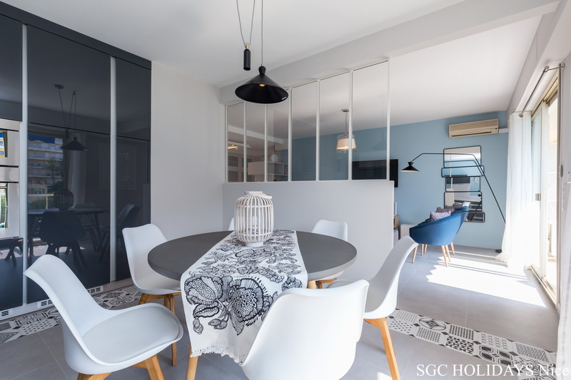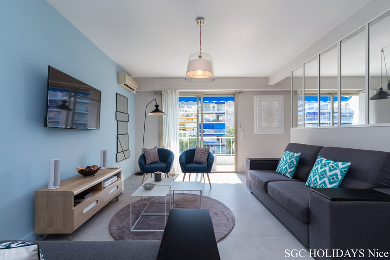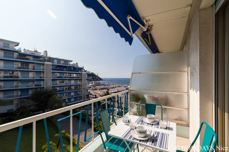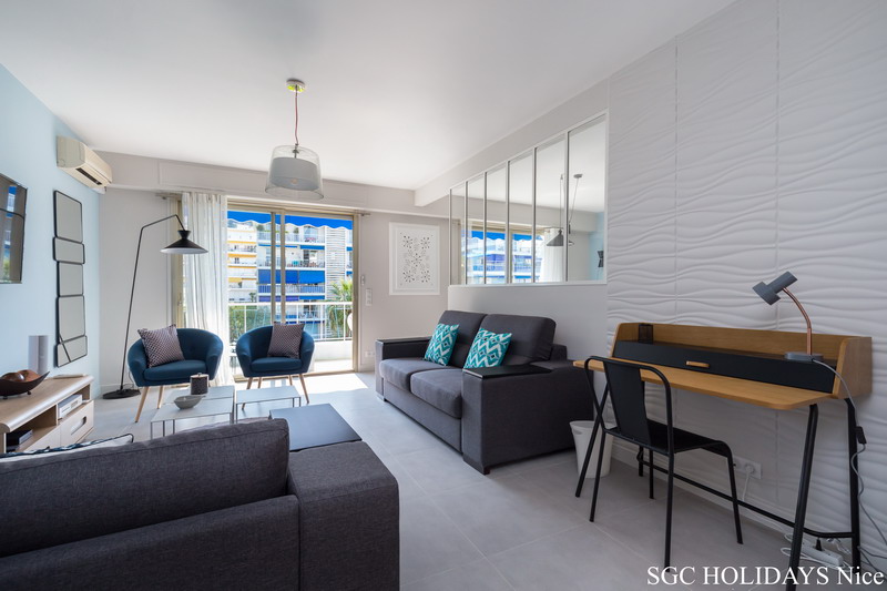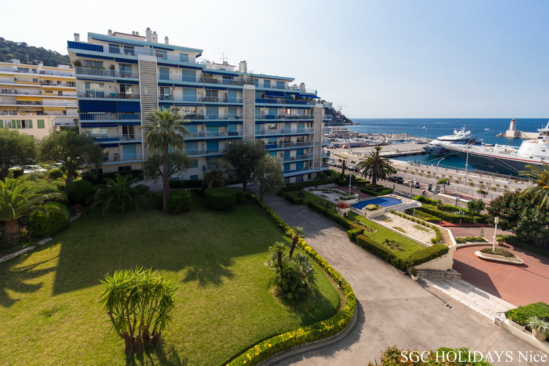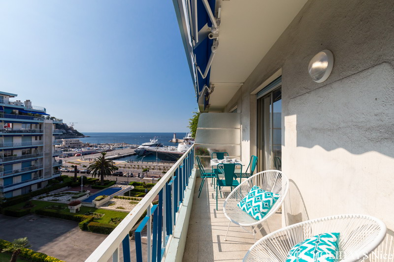 Nice Port area, located in a sea front residence, « the Bleu Rivage », this very nice modern 2 bedroom apartment fully air-conditioned, 2 bathrooms, 2 toilets and terrace with sea and Port view, has been totally refurbished in 2017.