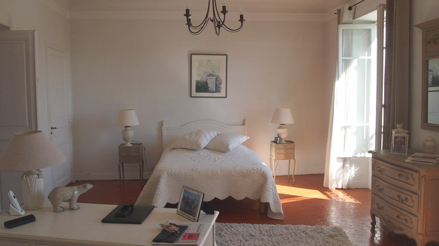 Très grande chambre lit double en 140 cm avec bureau attenant, balcon sud vue mer, salle de bains attenante (douche, baignoire, double vasque, wc),